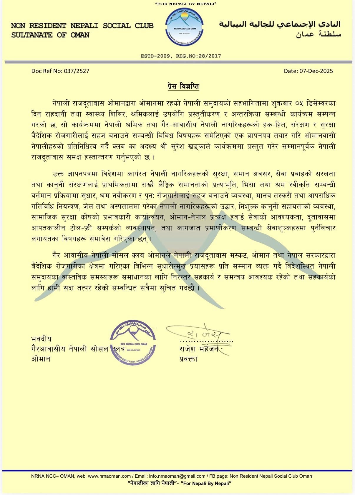 The NRN Social Club, Oman, expressed appreciation for the ongoing efforts of the Embassy of Nepal, Muscat, and the Government of Nepal, and reaffirmed its commitment to continued cooperation in addressing the genuine concerns of the Nepali community abroad.